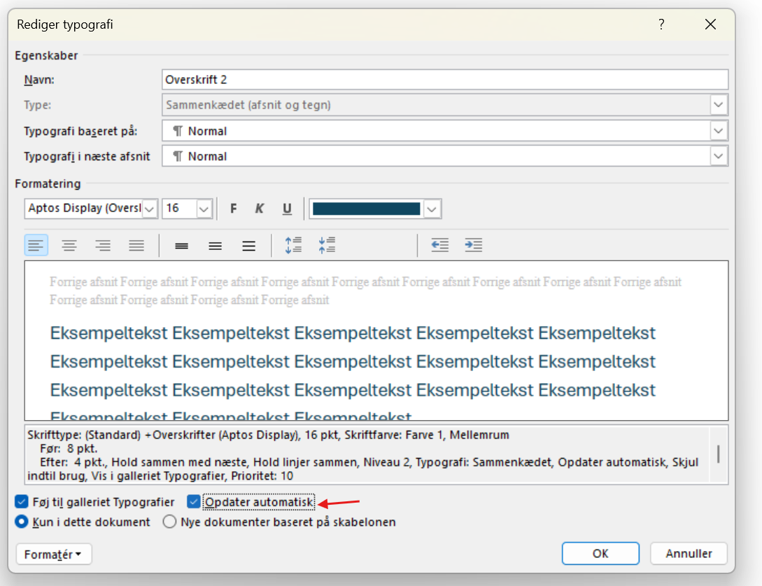 Hvis vi følger eksemplet, vil alle dine Overskrift 2’er bliver opdateret med den nye formattering
