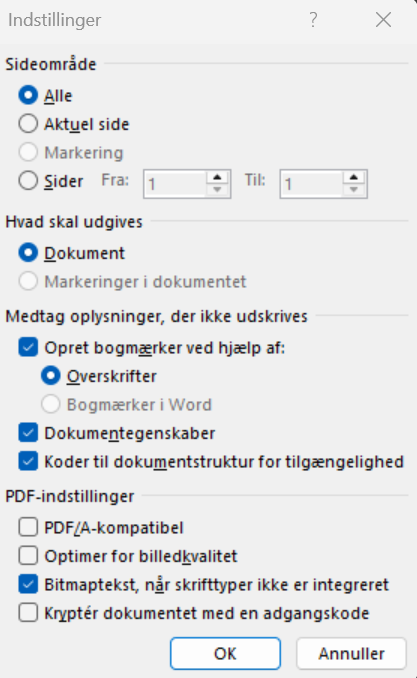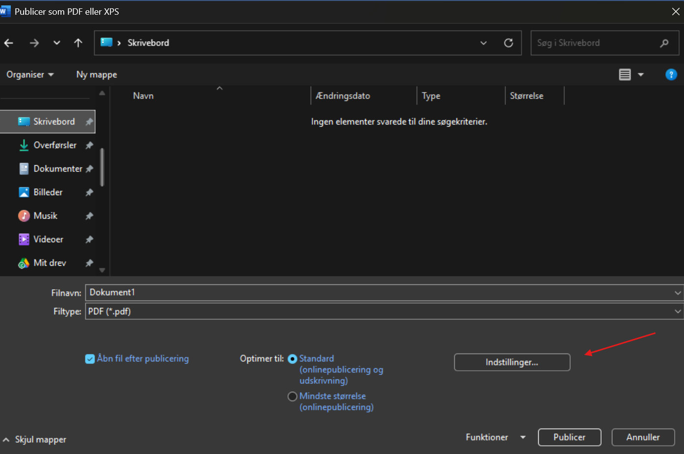 - Som standard er indstillingerne for “Åben fil efter publicering” og “Standard (online publicering og udskrivning)” valgt. Det er fint.