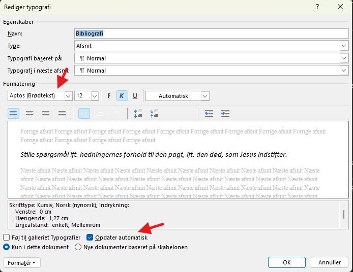 - Vælg nu den skrifttype, du bruger i brødteksten. Husk også at trykke “Opdater automatisk”, så alle bibliografier i dokumentet bliver opdateret.
