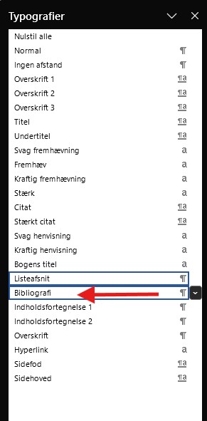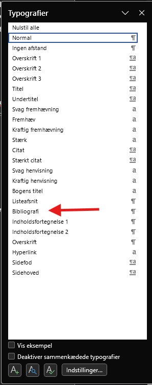 - Nu kan du lave et almindeligt klik på “Bibliografi” i skrifttype-menuen og alle bibliografier i dokumentet vil blive opdateret med rigtig stifttype.