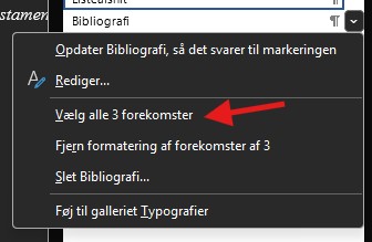 - Højreklik på Bibliografi igen, men vælg nu “Vælg alle X forekomster”