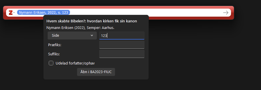 Når du har valgt en reference, kan du inden, at du trykker Enter, skrive sidetal.